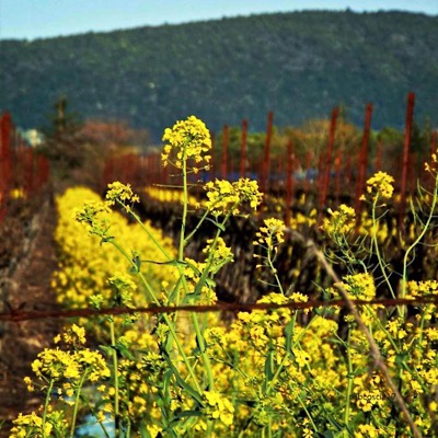 Mustard seeds sown by vintners or growing wild in the vineyards return to bloom here every winter. They help suppress fungal pathogens and nematodes that attack roots, and then are plowed under in the spring, providing nutrients to the vines.